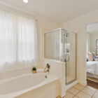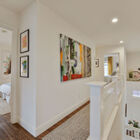 From a dramatic staircase in the living area, you can ascend to the home’s upper level, which includes a spacious, light-filled owner’s suite with a split bath with both a step-in shower and a tub, as well as a large vanity with dual sinks and a walk-in closet.
