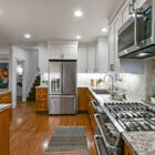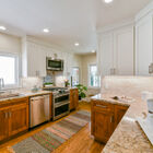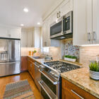 - Chef’s kitchen with Cambria countertops, custom cabinets, fridge with built-in coffeemaker, and¬† 6-burner gas range with dual ovens