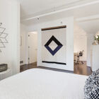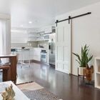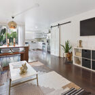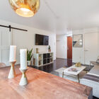 From the entryway, the open floor plan creates a modern great room with the spacious living room open to the generous dining room. Oversized windows and sliding glass doors onto a private tree-lined patio provide a peaceful indoor/outdoor flow. The modern kitchen boasts open shelves, solid surface countertops and subway tile backsplash, stainless steel appliances, cooktop with built-in oven, and built-in microwave. Behind a charming barn door off the kitchen is a walk-in pantry with space for just about everything the home chef could need. Also on this level is a conveniently placed powder room.