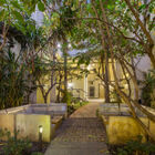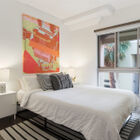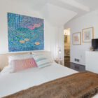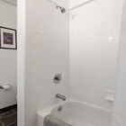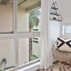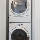 Upstairs, two en suite bedrooms with tall windows overlook the inner courtyard. Both have huge, open concept closets, and one bedroom has currently configured the closet as an office alcove. One adjoining bath features dual sinks and walk-in shower with subway tile and frameless glass door, while the second bath features a shower over tub and single sink. A stacking washer and dryer on this level eliminate the need for carrying laundry up and down the stairs.