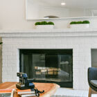 Wide windows light the expansive family room adjoining the open kitchen. A brick fireplace warms chilly evenings, and a second set of glass French doors open to the enclosed backyard, convenient for taking food and drinks out to visiting family or friends.