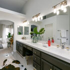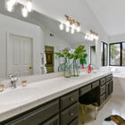 Upstairs, the spacious primary suite enjoys a vaulted ceiling and wide corner windows overlooking the neighborhood. The adjoining split bath is a luxurious retreat with a vaulted ceiling and jetted tub with tile surround nestled beneath corner windows. The bath also features a walk-in shower, wide vanity with dual sinks, and a large walk-in closet. Two additional bedrooms - each with large closets - are joined by a full bath with shower over tub and vanity for storage.