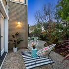 The professionally landscaped backyard is a tranquil oasis with a large pebbled patio flanked by lush lawns and surrounded by mature trees, shrubs, and colorful plantings.