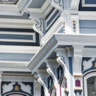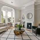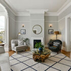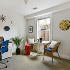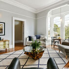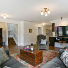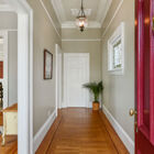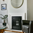 The spacious living room, with its hardwood floors, high ceilings, and glorious bay window provides a sense of the Victorian period with wide doorways, elaborate scrollwork, picture rails, crown moldings, and baseboards. A remote-controlled electric fireplace with marble hearth is flanked by glowing sconces, and the bay window creates a cozy spot for a window seat overlooking the street - open the windows and get the ambience of a covered porch.
