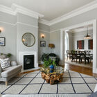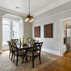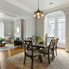 The adjacent formal dining room is beautifully proportioned and large enough for a holiday dinner with extended family or friends. A vintage light fixture descends from the carved ceiling medallion, and a bay window casts a sunny glow.