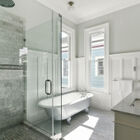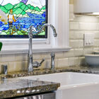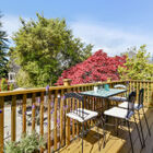 The beautifully remodeled eat-in chef’s kitchen is a pleasure to cook in with its Bosch 5-burner gas cooktop, built-in convection wall oven and microwave, and large counter-depth SubZero refrigerator. Stylish modern features include stone counters with subway tile backsplash, and the window above the farm sink is lit by a stained glass insert that provides color and privacy. Charming vintage style cupboards reach to the high ceiling, providing abundant storage, and a small breakfast nook is perfect for quick meals. A nearby glass door opens onto the deck, making this a great kitchen for summer entertaining - or just for taking a cup of coffee out to enjoy the warm weather.