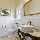 The traditional porch, with transom window over the front door, opens onto a generous entryway whose beautiful hardwood floors are accented by a decorative inlay, and a stained glass window shines with color and elegance. Just off the entryway, a conveniently placed powder room has been exquisitely renovated with a unique vanity, wainscoting, and stone tile floor with metallic tile inlay.