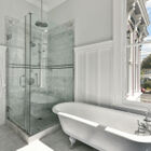 The opulent owner’s suite is a private retreat with sunny windows and multi-paned glass door out to the deck. Two large walk-in closets - one in the bedroom and one in the adjoining bath - provide abundant storage. A marble floor with decorative basket weave inset, marble-topped vanity with dual sinks, and a gorgeous chandelier add sophistication to the lavishly appointed spa-like split bath, while light streams in through tall windows. The magnificent marble walk-in shower features two showerheads and an additional gigantic rain showerhead above. A luxurious clawfoot tub is ideal for soaking away the stresses of the day.