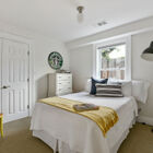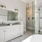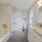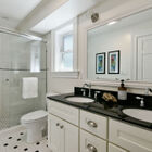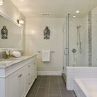 A stylish private guest suite features oversized windows for abundant light, and the adjoining spacious bath boasts a marble-topped vanity with dual sinks. A tub with subway tile backsplash and handheld showerhead is paired with a corner step-in shower lined by subway tile with a decorative inlay. A huge double closet provides storage.