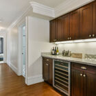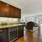 On the lower level, an expansive light-filled family/media room is lit by windows on two sides, and glass French doors open onto the patio and gorgeous backyard. A nice addition is the nearby wine fridge with cabinets on either side--a perfect reason for strolling out to the patio with a glass of sparkling champagne.