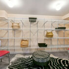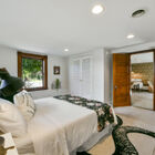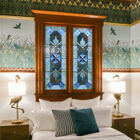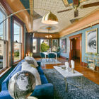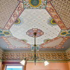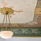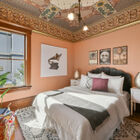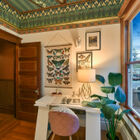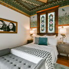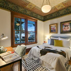 On the other side of the hallway are three bedrooms. The largest of the three boasts high casement windows of stained glass, a delicate mural of birds and flowers, and a ceiling adorned with colorfully patterned wallpaper. The remaining two bedrooms also feature beautifully wallpapered ceilings and borders, as well as large double-hung windows, and antique pendant lights.