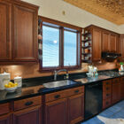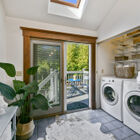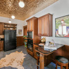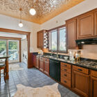 Beneath a distinctive embossed copper ceiling typical of the 19th century, the large eat-in kitchen has been stylishly remodeled with a custom breakfast bar supported by an antique newel post, stone-topped counters and copper backsplash, abundant cabinets, a gas cooktop, and built-in oven and microwave. At the far end of the kitchen is a laundry room with a sliding glass door onto a small deck - a perfect place for morning coffee or relaxing while dinner simmers on the stove.