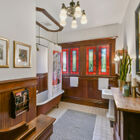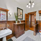 The expansive bath has been remodeled in the style of the Victorian era with burnished wainscoting, a cistern toilet, period pedestal sink, and freestanding clawfoot tub with shower. A marble-topped cabinet provides storage for the fluffy towels and bath salts needed for luxurious soaks, and two sets of casement windows with stained glass panels add a colorful touch of elegance.