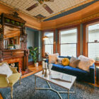 In the gracious living room, warm hardwood floors bask in the natural light streaming through the wide bay window, and the coved ceiling is embellished by gorgeous, intricate wallpaper. An ornately carved period fireplace features decorative tile, and a mirror reposes above the antique mantle. A second bay window fills the adjoining dining room with light, and a gleaming built-in hutch offers space for storage and display.
