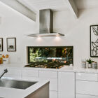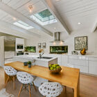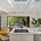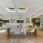 Dual skylights shine down on the sleek modern kitchen with stone countertops, abundant cabinets, and awning windows. The discerning home chef will delight in the Miele 5-burner gas cooktop and hood, SubZero fridge, and Miele built-in oven and coffee machine. The expansive custom island provides additional space for meal prep, and the wide, deep sink and Miele dishwasher make for easy cleanup. The attached built-in alder wood breakfast bar is ideal for quick meals.
