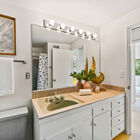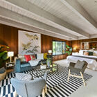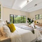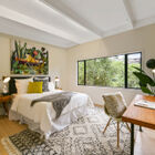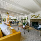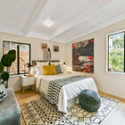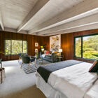 On one side of the living area, two bedrooms share a generous bath with shower over tub and large tile vanity typical of the mid-century era. On the other side, a private staircase leads up to the wood-paneled owner’s suite - large enough to be furnished as a bed and sitting area. The timber ceiling with exposed beams follows the slanted roofline, and wide windows fill the room with natural light. A large walk-in closet and second closet with cedar walls and floor provide abundant storage, and the adjoining bath features a shower over tub, wide vanity, and sunny skylight.