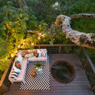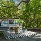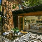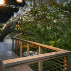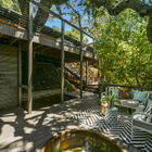 An entertainer’s dream, the open floor plan allows guests to mingle freely, chatting with the chef, warming themselves in front of the brick fireplace, or enjoying the surrounding landscape through enormous picture windows. On warm nights, a series of panoramic glass doors fold back to bring the outdoors inside and allow the party to spill out onto the expansive redwood decks and take a dip in the cedar hot tub beneath a canopy of trees.