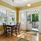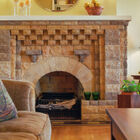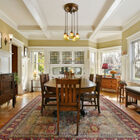 - Architectural and design features include hardwood floors with mahogany inlay, coved and box-beam ceilings, pocket doors, fireplace, wainscoting, plate rails, picture moldings, built-ins, window framing, period-style sconces, art nouveau- and schoolhouse-style hanging fixtures, and period-style tilework