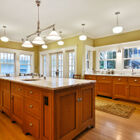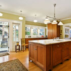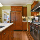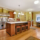 - Spacious, well lit, and completely renovated kitchen overlooks the rear garden and features a wide chefs’ island with breakfast bar and under-counter storage, marble counters, six-burner Wolf gas range with griddle, concealed SubZero refrigerator and microwave cabinet, two dishwashers, and breakfast nook, and opens onto the tranquil private rear deck