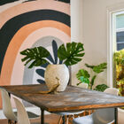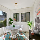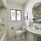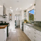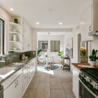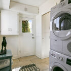 The modern kitchen is a stylish blend of sleek stone countertops and backsplash with vintage-style cabinets and built-in corner hutch. The home cook will appreciate the gas range and Bosh dishwasher, and the light-filled breakfast nook is an ideal spot for quick meals. The adjacent laundry room includes plentiful cabinets and a stacking Bosch washer and dryer, and a door that opens onto the enchanting back garden.