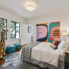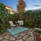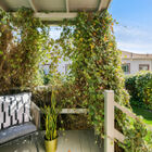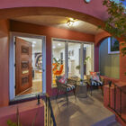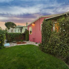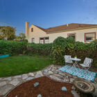 The enclosed back yard is reminiscent of a secret garden with a lush lawn, flagstone patio, and whimsical birdbath. Trailing trumpet vines and ivy adorn the surrounding fences creating a tranquil, private grotto.
