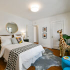 Two generous bedrooms, each with their own charming features, share a bath with shower over tub, pedestal sink, and large linen closet.