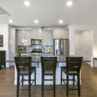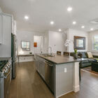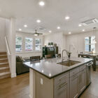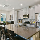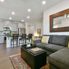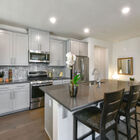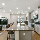 - Chef’s kitchen with modern appliances, quartz countertops, a large island, and breakfast bar