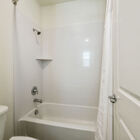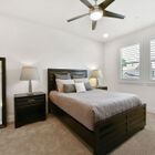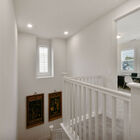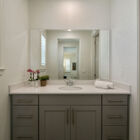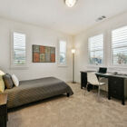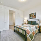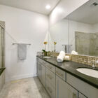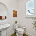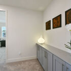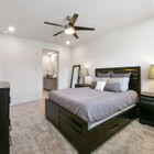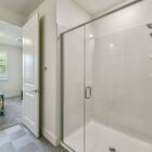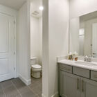 The second level of this efficiently designed home includes the primary owner’s suite, with a spacious bedroom and a luxurious split bathroom, replete with a broad vanity with dual sinks, a large shower with seating, and a walk-in closet with custom shelving. On the other side of the hallway, you’ll find a third spacious en-suite bedroom with a split bath.