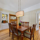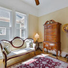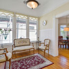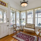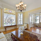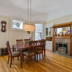 - Gorgeous period details throughout, including oak floors, wainscoting, bay windows, ornamental window frames and mouldings, stained glass, built-ins, wood-burning fireplace, and pocket and French doors
