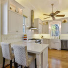 - Spacious modern kitchen features ample storage and counterspace, built-in bench seating, breakfast bar, six-burner gas range, top-of-the-line JennAir and Samsung appliances, oak hardwood floors, and more