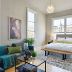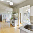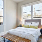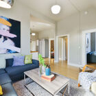 - Airy and modern ground-floor unit has high ceilings, bamboo hardwood floors, extra-tall windows, and a floor plan that allows you to see different rooms from different angles in the home’s open common areas