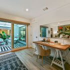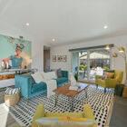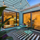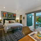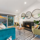 The front door of this splendid home opens onto a spacious entryway leading to a light-filled open common area with vaulted ceiling and windows on three sides that create a refreshing feeling of indoor/outdoor flow. Sliding glass doors in the sun-washed dining area open to the side yard with access to both the front and back gardens, and oversized picture windows across the room overlook an interior patio. A second set of sliding glass doors in the living room open onto the shaded back patio.