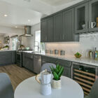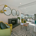 Recently remodeled and open to the common area, the sleek chef’s kitchen will delight the discerning home cook. Beautifully designed with expansive custom stone counters and decorative tile backsplash, the kitchen includes a five-burner gas range, wine fridge with glass rack, and abundant storage with semi-custom cabinets above and below the counters as well as a custom storage closet and two pantry cabinets with soft-close shelves. A stone-topped breakfast bar is perfect for quick meals, and a breakfast nook basks in the natural light illuminating large windows overlooking the enchanting front garden. A deep window over the farm sink provides a sunny space for an indoor herb garden.