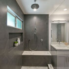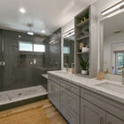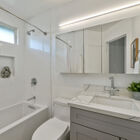 The two additional bedrooms share an updated bath with tile shower over tub, vanity with custom countertops, and extra-wide mirrored medicine cabinet.