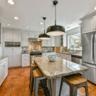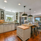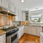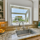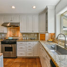 Back inside, pass through the dining area and you will find the kitchen, which has been beautifully upgraded to include ample cabinetry with cabinets that reach to the ceiling, shining granite countertops, stainless steel appliances, and island with breakfast bar. A greenhouse window through which you can see the bay graces the sink area, while throughout the kitchen, a charming chiseled tile backsplash provides delightful continuity.