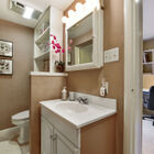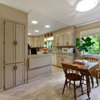 The eat-in kitchen has a warm, open feeling, with Pergo floors, tile counters, an electric cooktop with grill, built-in double oven, and substantial cupboard space. A great congregating place for parties or family dinners. Beside the kitchen is a smaller dining area for informal meals. Here too are floor to ceiling cupboards for a very large pantry or storage area for all your kitchen wares.