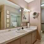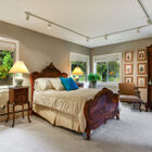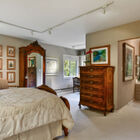 Windows on three sides flood the spacious owner’s suite with natural light. A built-in desk is surrounded by bookshelves, and there are two full closets for ample storage. The adjoining bath features a tile vanity, shower over tub, and a separate step-in shower.