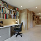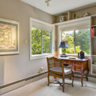 Another light-filled bedroom and bath are down the hall, with built-in shelving for storage and display, and the built-in desk overlooks the treetops and front garden.