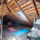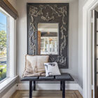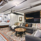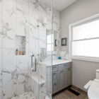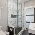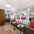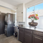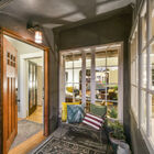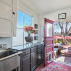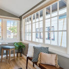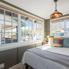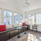 Between the dining room and kitchen, a custom barn door of iron and multipane glass allows you to close off the room without losing the home’s marvelous open feeling. The door slides open to reveal a stylishly remodeled chef’s kitchen with stone countertops, abundant cabinets, and a convenient breakfast bar for quick meals or for chatting with the chef during meal prep. The Miele dual-fuel range makes cooking a joy, and a greenhouse window over the deep farm sink is a perfect spot for an indoor herb garden. Like a mini-sunroom, the adjoining sitting area offers built-in banquette seating with additional storage beneath a series of sunny windows. An antique Chinese screen separates the sitting room from a laundry area with a large-capacity Electrolux stacking washer/dryer. A sliding barn door opens onto a sleek full bath - remodeled from the studs out - with a large walk-in shower with frameless glass door and vanity for storage.