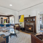 The front door opens onto a charming entryway with windows on the street. From there, a multipane glass door opens onto the gracious living room with softly lit crown molding, original oak floors refinished to a warm glow and a striking gas fireplace with custom wood mantel and tile inset that invites intimate conversation. Through an arched doorway lies the sun-washed formal dining room with dual sash windows and a period built-in hutch with drawers and display shelves.