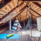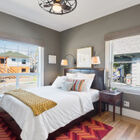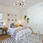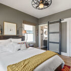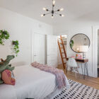 The three bedrooms each enjoy their own delightful features. The primary bedroom at the front of the home features large windows overlooking the garden, a distinctive ceiling fan, and a walk-in closet with a convenient built-in organizer system. The secondary bedroom includes a large closet with a surprise - a ladder leads up to an open attic with planked wood floors, peaked roof, and an operable skylight. Barn doors in each bedroom open to a gorgeously remodeled connecting bath with a large, beautifully tiled walk-in shower with frameless glass door and a wide floating vanity. To one side of the living room, French doors open to reveal a third bedroom, remodeled with banks of windows to create the feeling of a sunroom, comfortable office, or study.