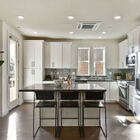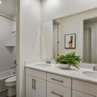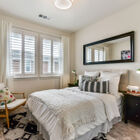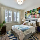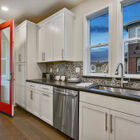 Upstairs, with windows on two sides, the owner’s suite gets abundant light and features partial views of the shoreline path, marina, and Oakland Estuary. The walk-in closet with Elfa storage units will help keep you organized. The spacious bath includes two separate vanities, walk-in shower with seating, decorative tile accents, and glass doors.