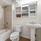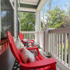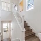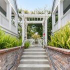 Up the stairway are two bedrooms, one the sunny owner’s suite featuring a glass-enclosed shower and a large walk-in closet with built-in storage system. The second bedroom is adjacent to a separate bath with shower over tub and pedestal sink. A conveniently placed stacking washer and dryer on this level eliminate the need to carry laundry up and down the stairs.