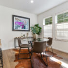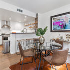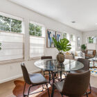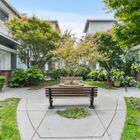 Behind a tranquil courtyard planted with Japanese maples and ferns, the front door opens onto a spacious open common area, including an expansive living and dining area lit by large windows, a generous eat-in chef’s kitchen with stone countertops, subway tile backsplash, gas range, ample cabinetry and counter space, and breakfast bar for informal meals. Outside, a private patio is surrounded by mature trees.