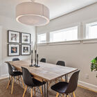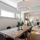 The windowed entryway opens onto a spacious living room with gleaming oak floors and large windows overlooking the tree-lined street. Two additional windows flank the converted Dimplex electric fireplace which provides ambiance and warmth without creating smoke or using fossil fuels. Through the open doorway is a formal dining room, lit by high transom windows.