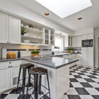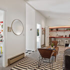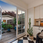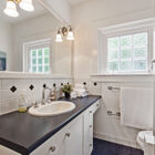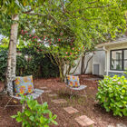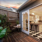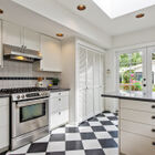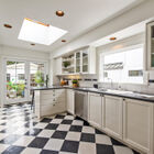 Adjacent to the dining room, the updated eat-in chef’s kitchen features a charming checkerboard tile floor, tile backsplash with decorative accents, and a Bosch gas range. Beneath the vaulted ceiling with skylight, the kitchen peninsula provides ample space for meal prep as well as a breakfast bar for quick meals. Plentiful custom cabinets and open shelving offer abundant space for the most well-stocked pantry. Off the kitchen, louvered doors enclose a washer and dryer, and custom energy-efficient multi-paned French doors open onto the peaceful deck.