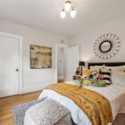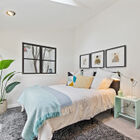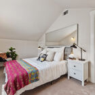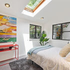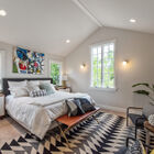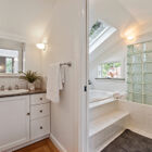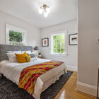 Upstairs, the spacious owner’s suite features tall windows overlooking the lovely backyard and views of the Berkeley hills. A vaulted ceiling that follows the peaked roofline, and additional oversized windows on the adjacent wall make this a light-filled retreat. Behind French doors, a walk-in closet provides abundant storage.