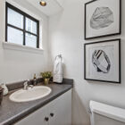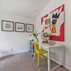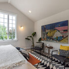 Also on this level, a guest room ideal for use as an office or nursery is lit by large multi-paned windows, and a vaulted ceiling creates a sense of space and tranquility.