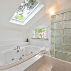 Natural light pours through a skylight in the sunny adjoining bath with its custom, stone-topped vanity and large walk-in shower with gleaming tile and decorative glass brick accents. A jetted tub with tile surround is ideal for a long soak after a stressful day.