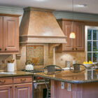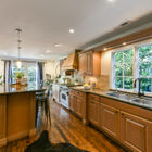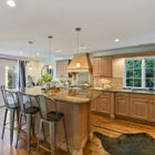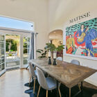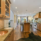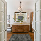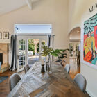 Anchored by a built-in stone-topped dining table set aglow by distinctive pendant lights, the dramatic open chef’s kitchen is the heart of the home, warmed by natural light streaming through two sets of multipaned French doors. The work area enjoys expansive stone countertops with stone tile backsplash and abundant cabinets. The discerning home chef will appreciate the Wolf four-burner gas range with grill, built-in paneled fridge, paneled Bosch dishwasher, and separate wet bar.